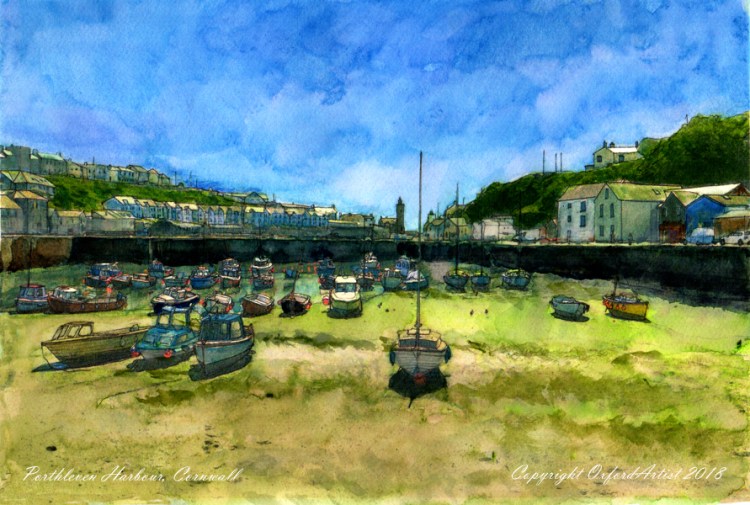 My watercolour view of Porthleven harbour in Cornwall on a rather idyllic summers day.