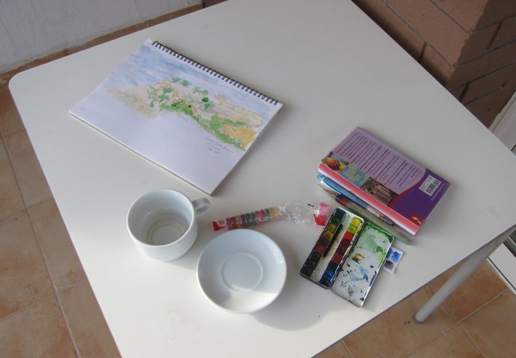 Unusually for this blog – a photograph – spending the siesta doing a little watercolour sketching from our hotel balcony while on holiday in Alicante, Spain. It’s a pleasant thing to do if you can find some shade… Sketching is better than sleep?