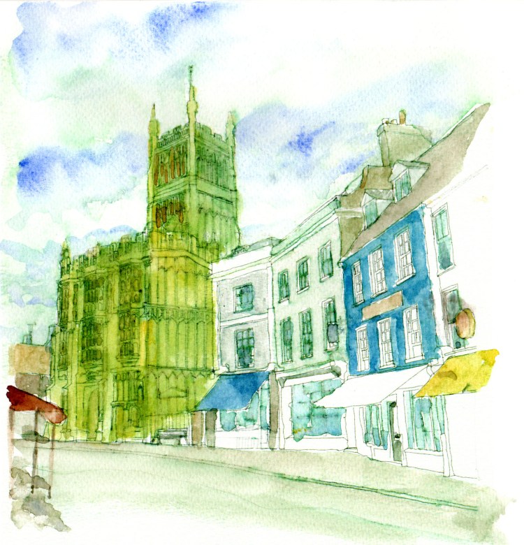 A watercolour sketch of the shops and houses along Market Place in Cirencester, and a partial view of St. John’s Church.