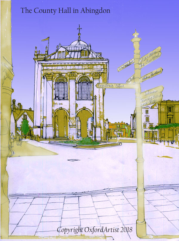 Here’s a different view of the rather impressive County Hall in Abingdon. For me this is a different style: a line drawing with solid blocks of colour infilling.