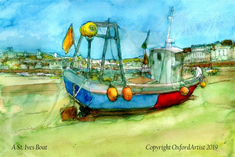 Another watercolour of one of the fishing boats in St. Ives harbour at low tide. This is a painting to remind me of a brilliant sunny day wandering around the beach before a breakfast in one of the near-by cafes.
