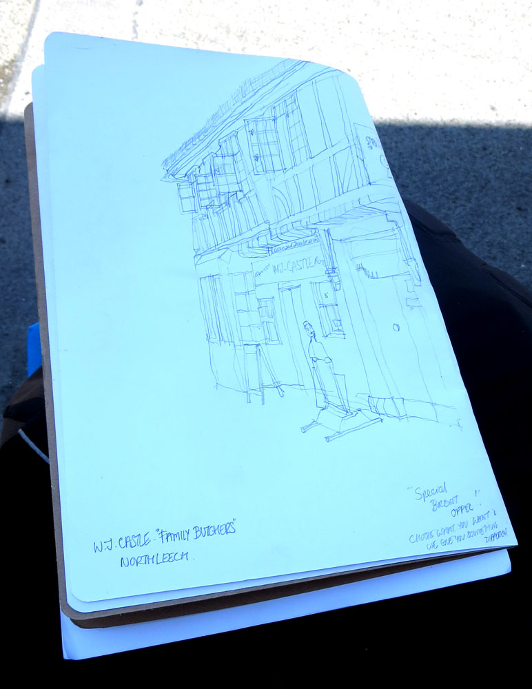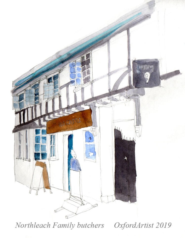 Out and about in the Cotswolds – and stopping to sketch this traditional Butchers shop in Northleach. Part of what I like is the way the timber framing has had time to twist and contort over time.