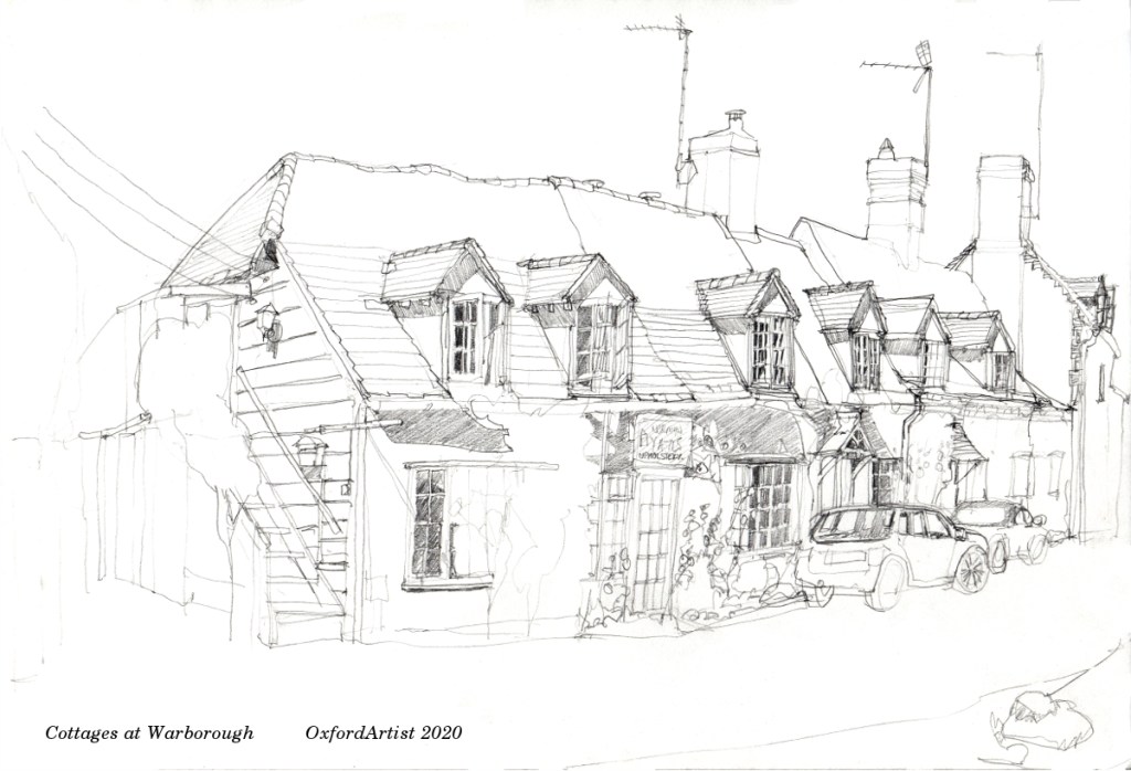 Taking advantage of the last of the good weather to go out and explore southern Oxfordshire some more. Today sitting out in some shade and drawing these cottages in the village of Warborough.