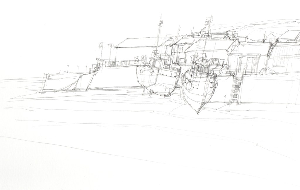 Taking some time to do some pencil sketches – and working up to this harbour scene.