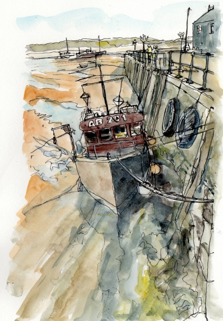 Here is another drawing and quick watercolour sketch -this time of one of the fishing boats moored up beside the estuary at Barmouth on the northwest coast of Wales. This is an image from a wander around the beach and foreshore on a particularly scenic evening. On this occasion the tide was quite a long way out, people were relaxing, eating seafood and drinking by the estuary with distant clouds rolling off of the hills up the estuary near Dolgelleu – all very pleasant.