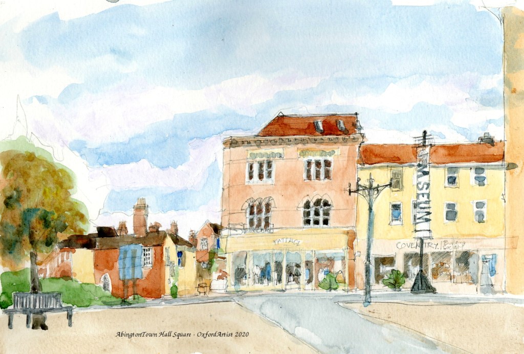 Despite a threatening rain front coming in across the country I decided to visit Abingdon for the first time in awhile. This was partly to drop off artwork and partly to explore again. After a quick walk around the town and a longer visit to their library I settled on the town Square for a Gregg’s Sandwich lunch. As it happens October is a good time to take in a view of the Town Hall because the maple trees are turning a fiery mixture of red, orange and yellow and starting to spread a pattern of fallen leaves across the Square.