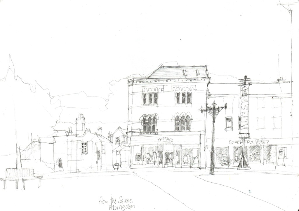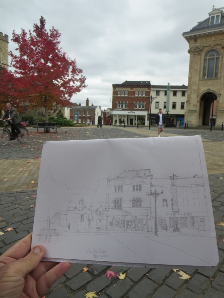 I took the opportunity to indulge in some sketching. Usually I’d go for a drawing of the rather grand Town Hall but today instead settled for the pattern of shops to one side of the Square. My thinking being that maybe I can come back with a larger sketchbook and try the rest of the view then.
