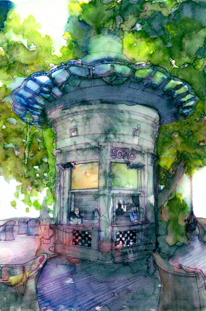 Here is something a bit different from me – it’s a painting of the Soho Bar in Alicante. The bar consists of a small rotunda kiosk with surrounding decking and wicker chairs – all beneath the shade of one of the large trees growing around the city parks. It is a great place for a drink or refreshments.
