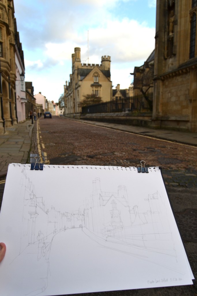 Merton Street is home to several colleges and I sat opposite the imposing Merton College Chapel to draw the street. Part of its charm is that it is that it is still mostly cobbled – which also explains the general lack of traffic here, just the odd car and intrepid scooter delivery rider bouncing up and down – most seemingly a bit lost.