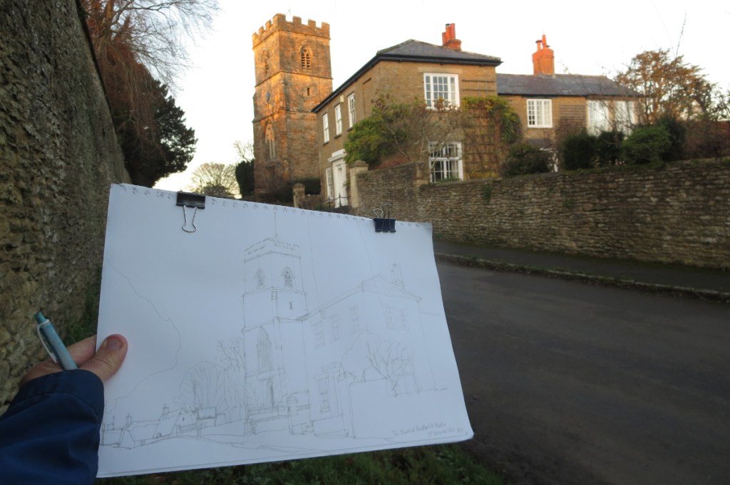 I decided to make the most of a cold but sunny day yesterday to go out and do a little exploring of a couple of churches in the Oxfordshire countryside. In late November the light doesn’t last very long and the cold is not really conducive to loitering around too long to draw or sketch. I did however manage to settle down for a half-hour or so to sketch the church at Sandford St. Martin, a small village in northern Oxfordshire.