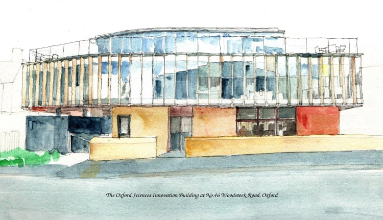 Just across the road is another new building – the Oxford Sciences Innovation Building at No. 46 Woodstock Road. On a windy day I decided to settle down by the entrance to ROQ and draw this confection of shiny glass and shuttering. Above is my resultant sketch in-situ.