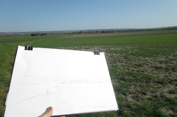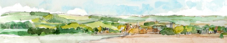About a month ago I was out sketching the South Oxfordshire countryside, which resulted in my post ‘Sketching Cholsey‘ (6th April). This is an update on that post – with my initial watercolour of the landscape looking towards Cholsey.