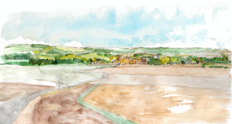 About a month ago I was out sketching the South Oxfordshire countryside, which resulted in my post ‘Sketching Cholsey‘ (6th April). This is an update on that post – with my initial watercolour of the landscape looking towards Cholsey.