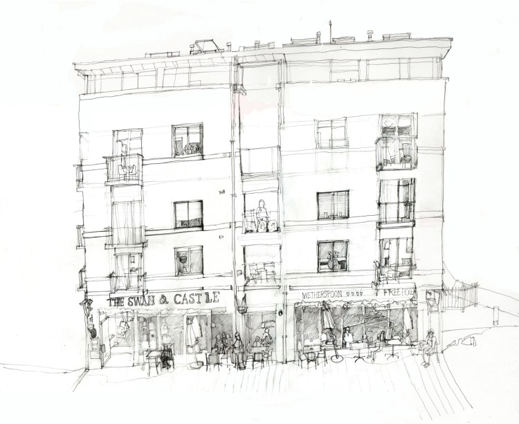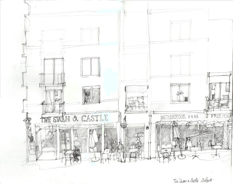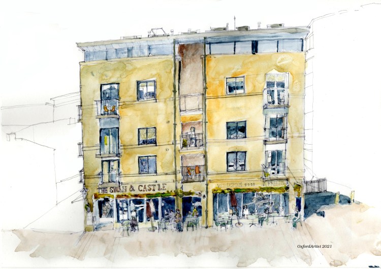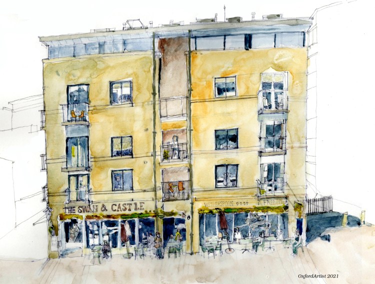 Over the course of this past year I have been drawing a series of studies of the Wetherspoons Swan & Castle building in central Oxford – conditions allowing. These drawings date back to a previous post with my initial sketchbook drawing in August 2020 as ‘A rainy day in Oxford‘
