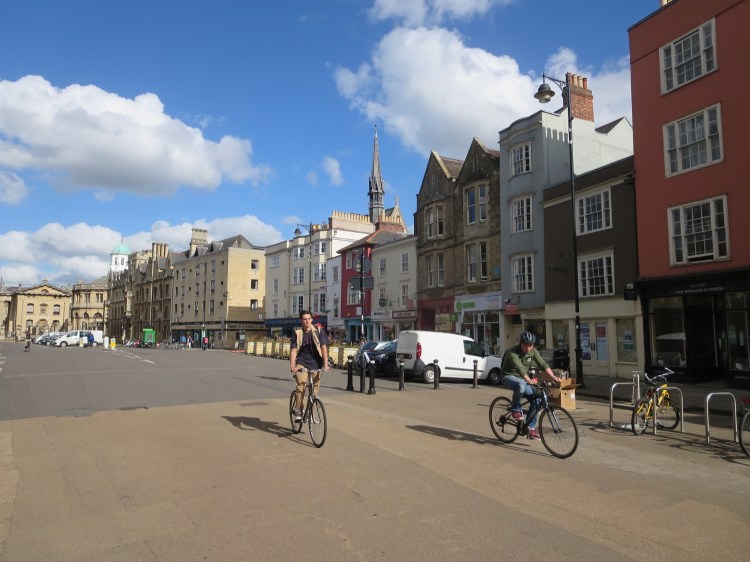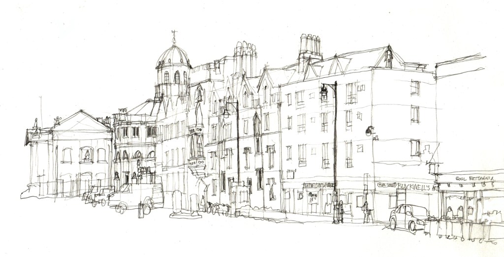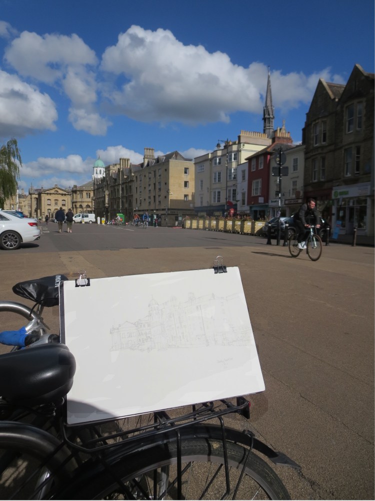 With the weather improving I decided to brave the showers and blustery weather to do some more drawing around Oxford. Finding a view point from among the various cycle stands on Broad Street I settled down to draw a view along the street.