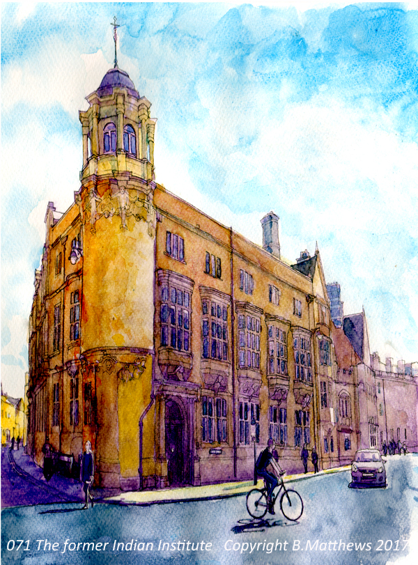 The weather hasn’t been up to much recently and I’ve mostly been drawing and sketching around Oxford. In a recent post of a watercolour of Broad Street I realised that this included in part a drawing of the former Indian institute – now the James Martin School. I also realised that I have a watercolour of this building from a few years ago – I include it here and this is where the image above comes from.