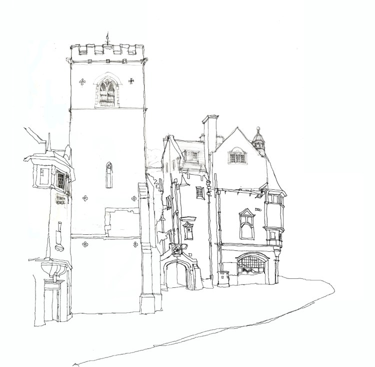 The above, progressing on from my earlier drawing, is a more complete drawing of the side of the tower and adjacent buildings.