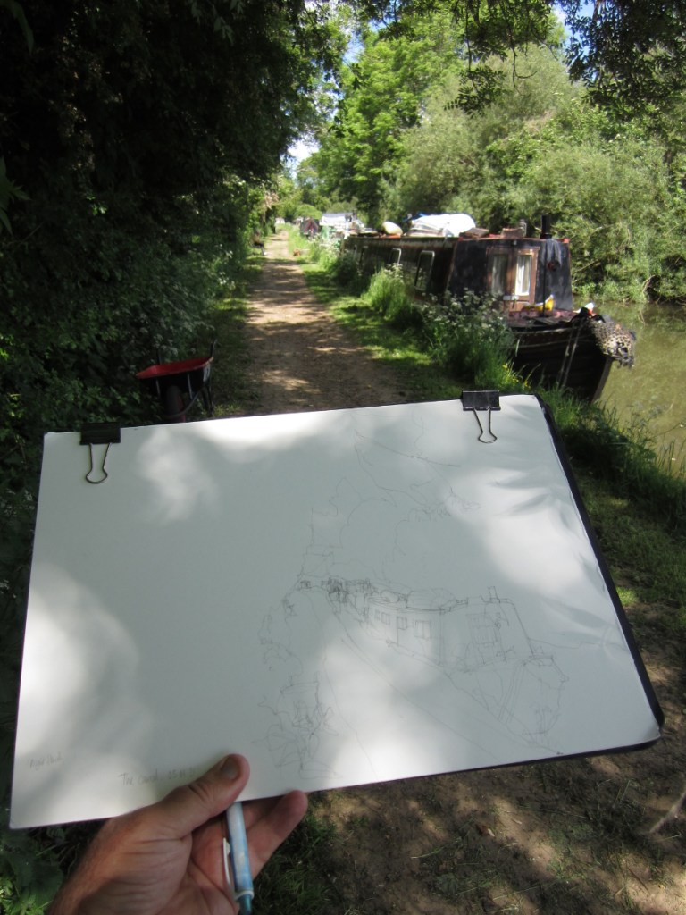 The photo above is of narrow boats moored up in the morning, with most people perhaps having a leisurely start to the day. With enough space and shade to unobtrusively sketch the above scene it took me about half an hour to produce my sketch below…