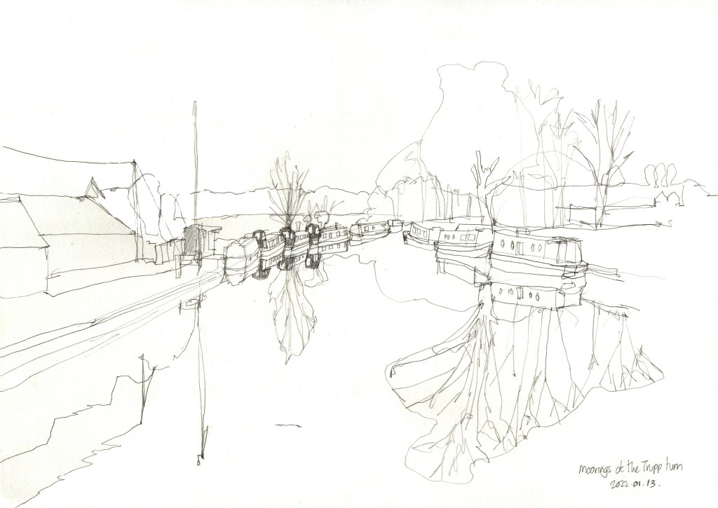 My photo above is from yesterday and shows my sketch in-situ at the Thrupp basin, a broad turning point and moorings on the Oxford Canal about 8 miles north of the city.