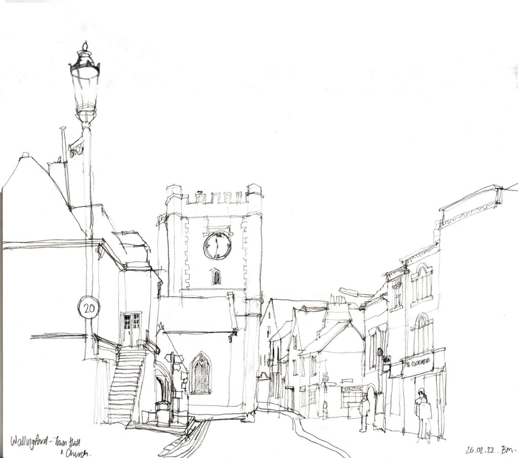The small market Square opposite Wallingford Town Hall is a good spot to eat the said sandwich. Today it was also just about warm enough to also settle down and do some sketching. Here is today’s offering- which you can also see in the in-situ photo above.
