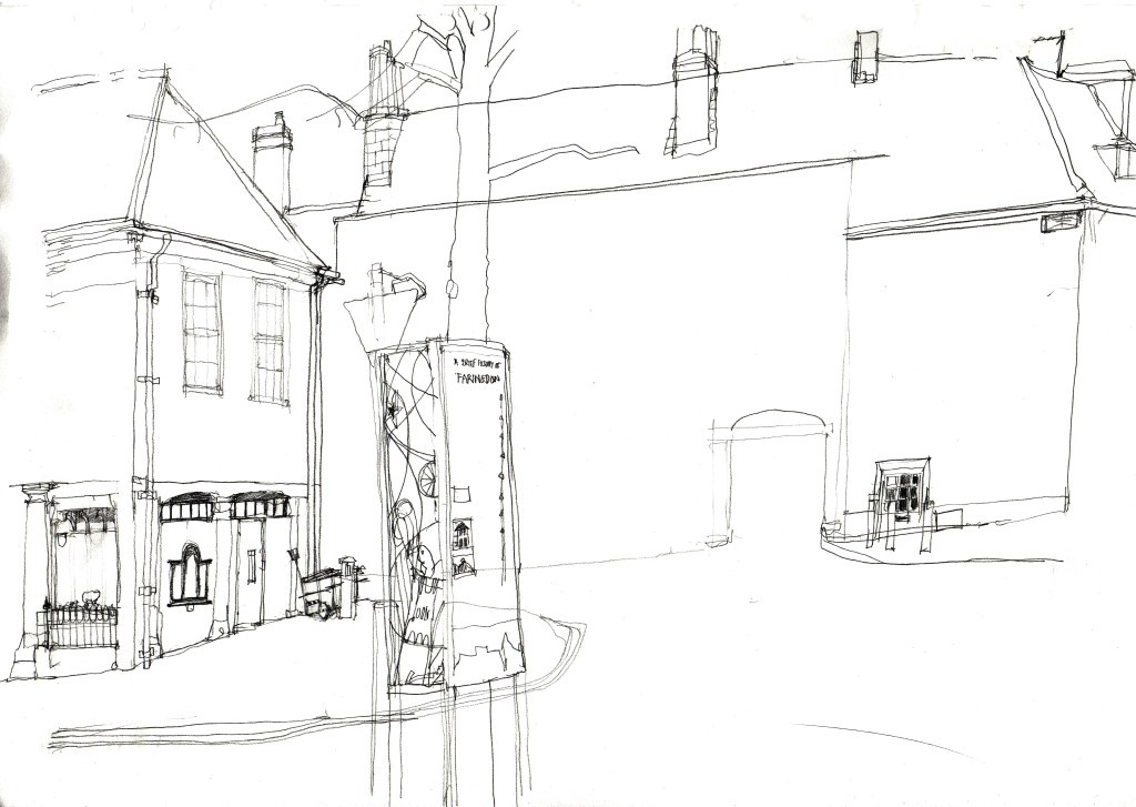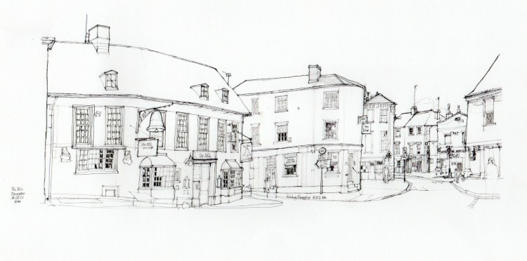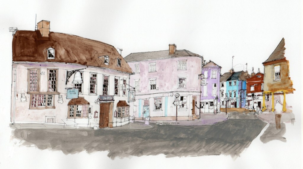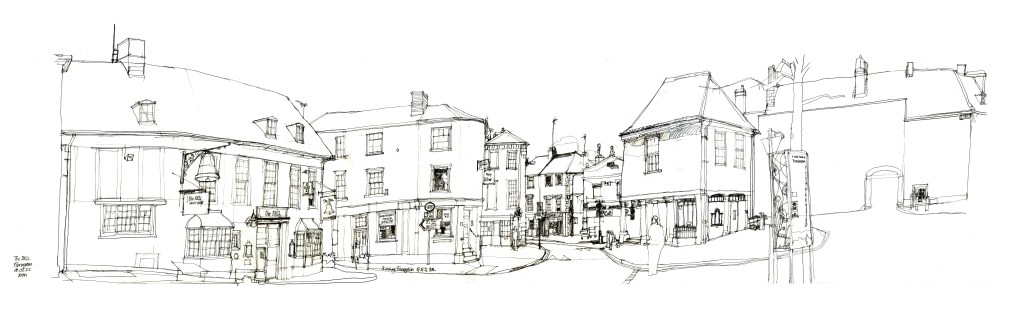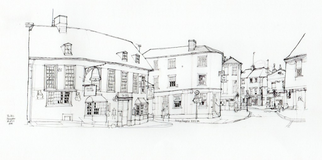 My last couple of posts have been about sketching in the Market Square in Faringdon, Oxfordshire. I’ve since been back and drawn a third part to add to this panorama – this is the drawing below…