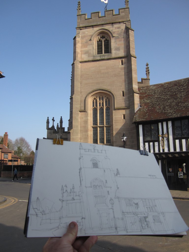 After a visit to the gallery, I found a suitable corner and set to drawing the chapel and school from there. Here are some photos of my progress…