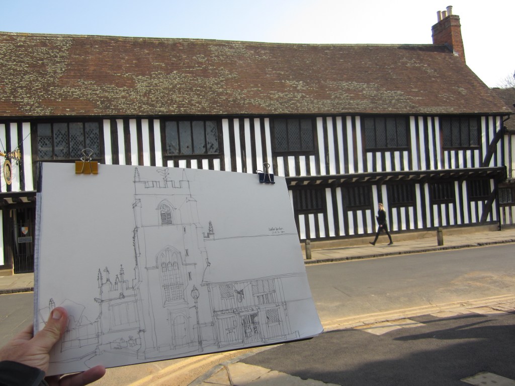 Beyond the Chapel are a row of half-timbered buildings, these being the Guildhall and Shakespeare’s former school.