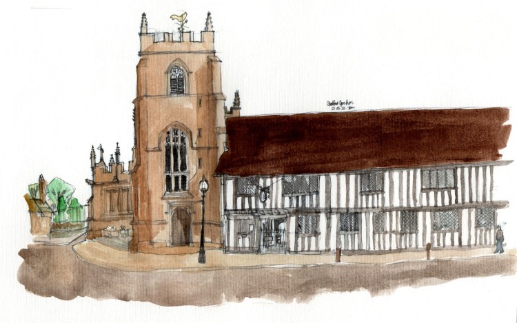 Beyond the Chapel are a row of half-timbered buildings, these being the Guildhall and Shakespeare’s former school.