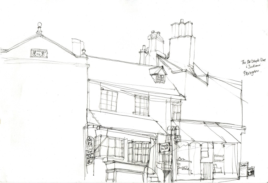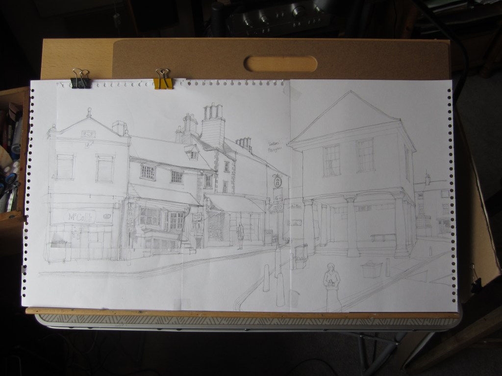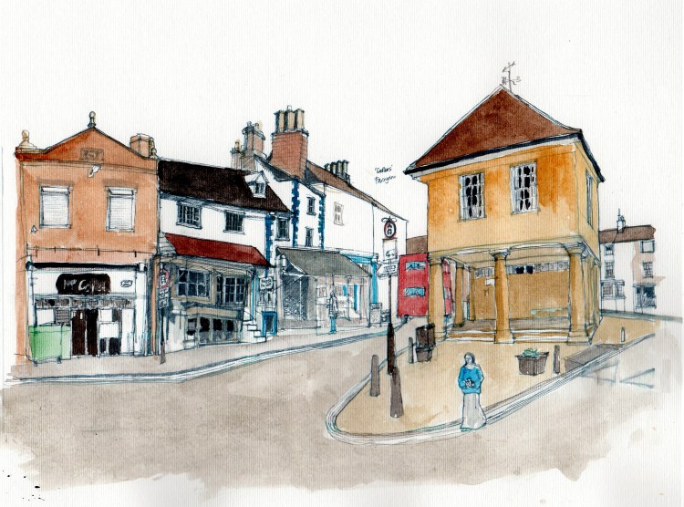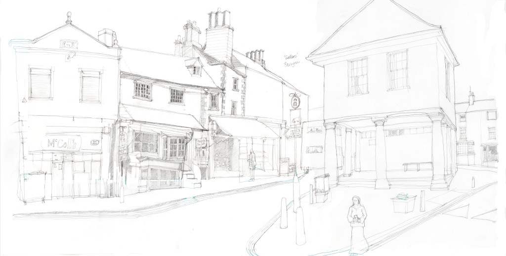 Faringdon Old Town Hall and the Market Square are at the centre of the town where the system of roads narrows down on the old coaching road. It was here I set up to draw and the montage of photos below illustrates this particular view.