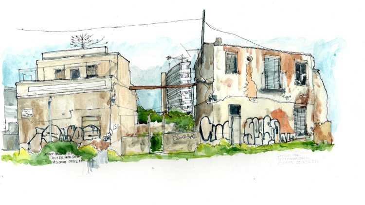 Over the years these houses have slowly decayed but from the perspective of an urban-sketcher they make great material. For this drawing I did two separate sketches of two adjacent houses to fit my sketchbook. Later, when back in the UK, I scanned these and then with some additional drawing joined the two sketches and added a little watercolour.