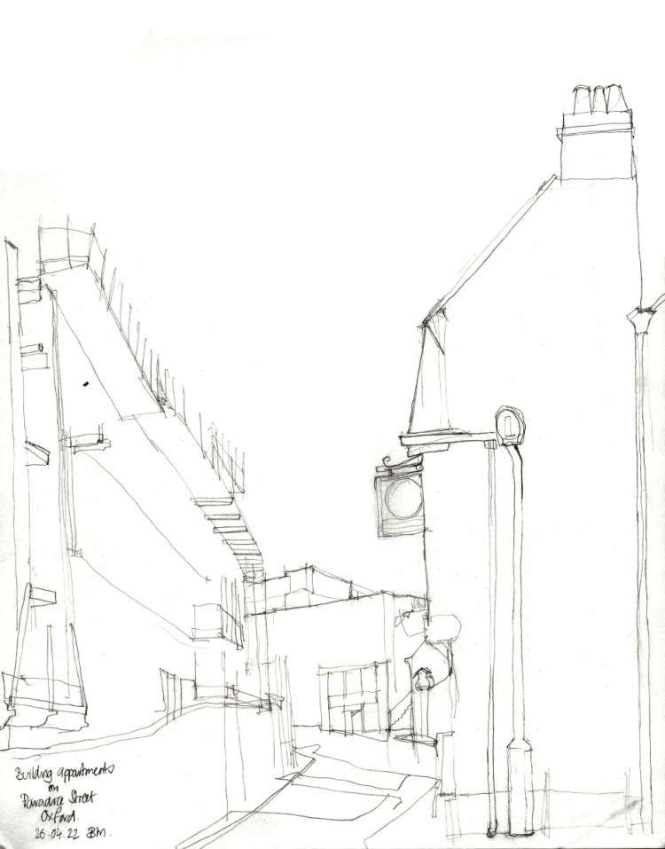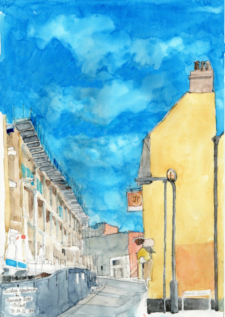 My last post was about drawing new construction works on Paradise Street in Oxford. This one is progressing thats a little bit further and turning it into a watercolour sketch.