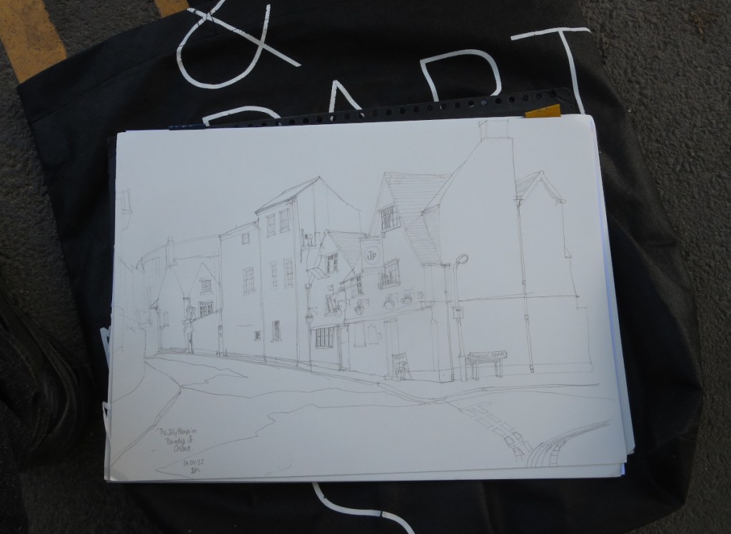 My last couple of posts have been of building works on Paradise Street in Oxford. This post is a continuation from that – but as a drawing of houses on the other side of the street including the Jolly Farmer pub.