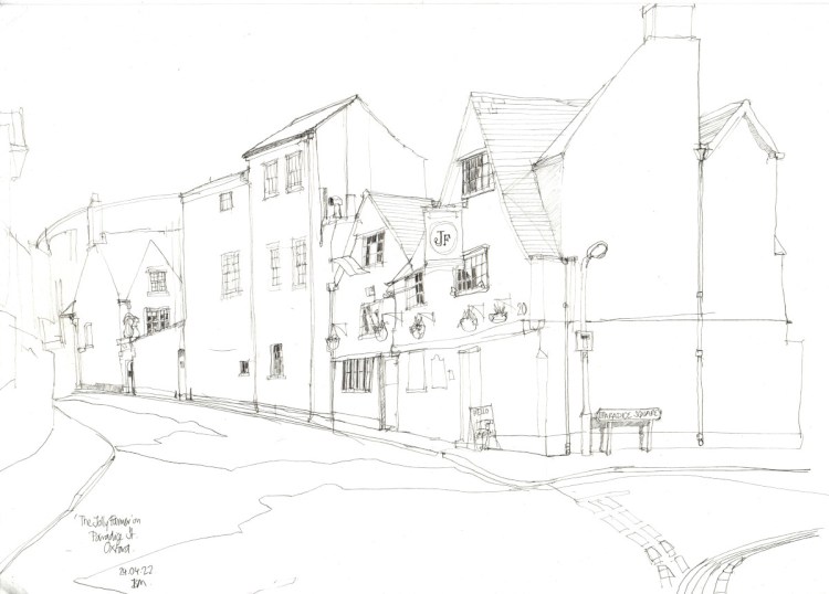 My last couple of posts have been of building works on Paradise Street in Oxford. This post is a continuation from that – but as a drawing of houses on the other side of the street including the Jolly Farmer pub.