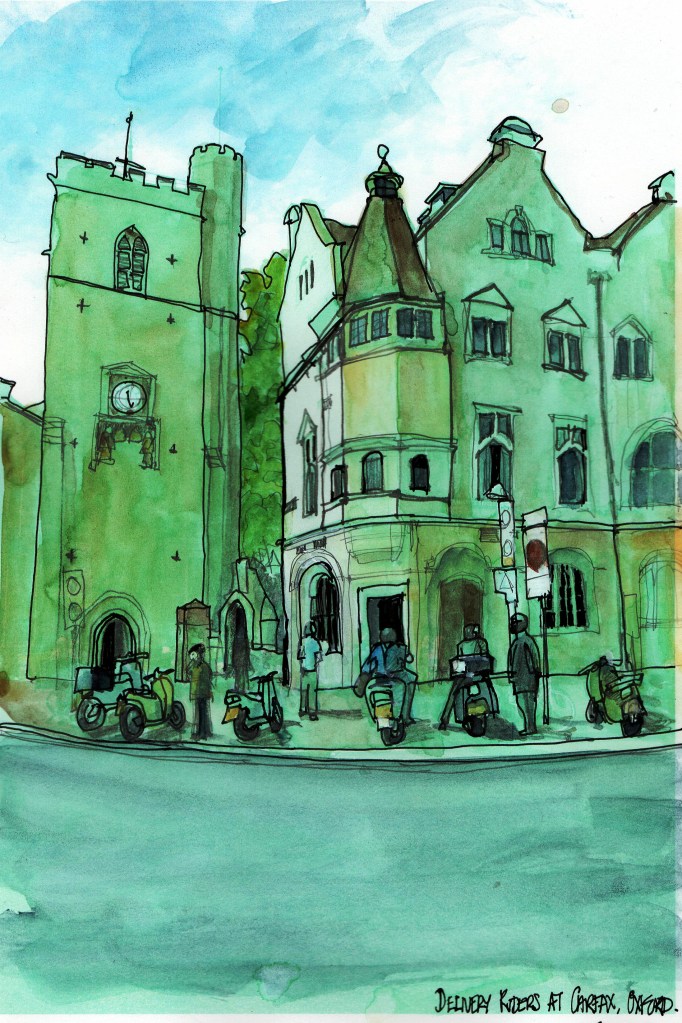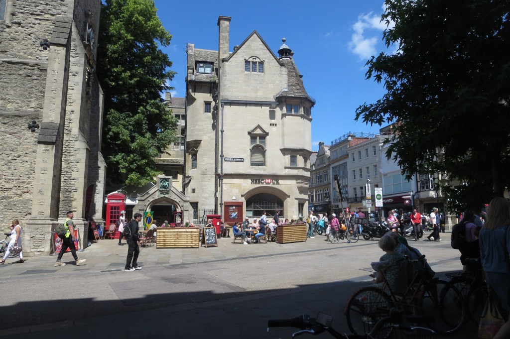 Here is a photo of the scene. The HSBC Bank occupies a rather fine building next to St. Martin’s Tower and a cafe now spills out into an area that used to be a church, demolished at the end of the 19th C. (to allow better traffic flow). There have been recent moves to make parts of the centre of Oxford more traffic free. One result of that is that Carfax is now also a favourite spot for scooter delivery riders to park up between orders.