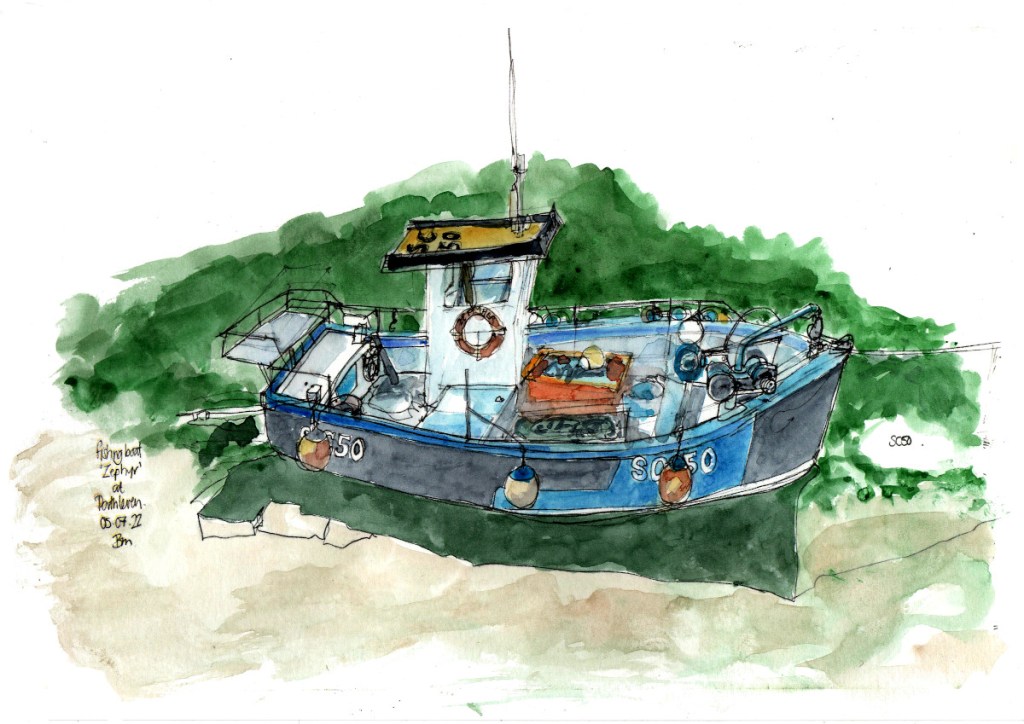 This post is of a drawing of one of the small fishing boats moored up there – the ‘Zephyr’.