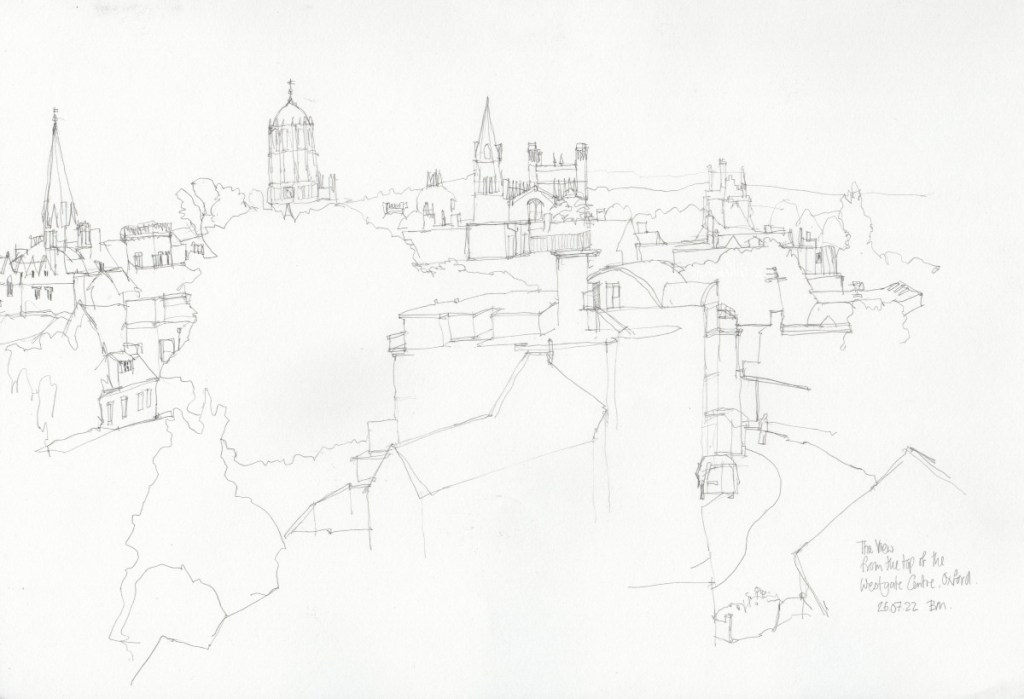 The Westgate centre in Oxford is the city’s latest bigger, brighter incarnation of a shopping centre. It has dozens of shops over several levels and a rooftop level populated by various restaurants. The rooftop also has a view of the Oxford skyline, looking out towards the east. This is something that I’ve been meaning to get around to do a drawing of for some time. Over a couple of visits I’ve managed to do this – producing a panoramic drawing in two parts. This post is about part 1 of these 2 drawings.