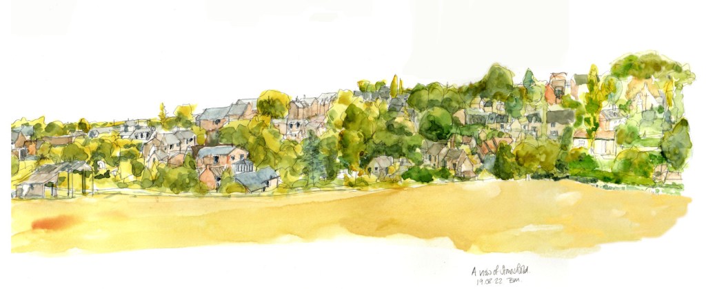 Stonesfield is about 8 miles NW of Oxford and so is quiet enough for me to enjoy getting out in the country again. Last week I did a post of a couple of drawings in the village of ‘The Old Bakehouse’. This time, having done some previous reconnoitering, I decided to try a landscape view from just outside the village. Setting up on a farm track, I drew a series of smaller sections of this landscape, gradually joining them together. Like most en plein-air it was again something of a learning experience as I went along.