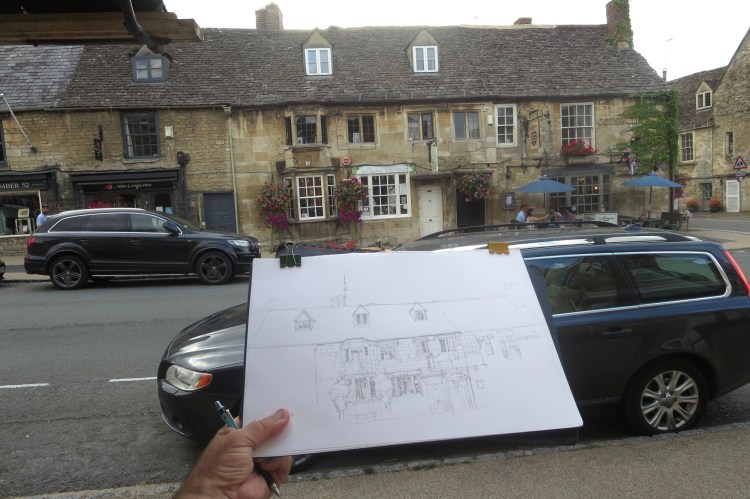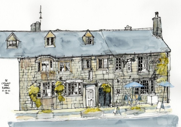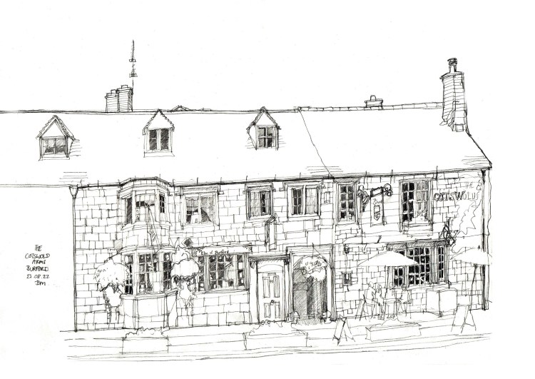 Burford is sometimes known as ‘the gateway to the Cotswolds’. Like other popular Cotswold towns, it can often be a bit overwhelmed with parked cars and traffic – especially on a Bank holiday weekend. It can also sometimes be quite daunting to draw here – if you can find a space and your view isn’t too full of cars. Luckily, I managed to visit the town on a quieter day and found a spot to draw from, across the main road from the Cotswold Arms, one of Burfords’ many fine old stone-built pubs.