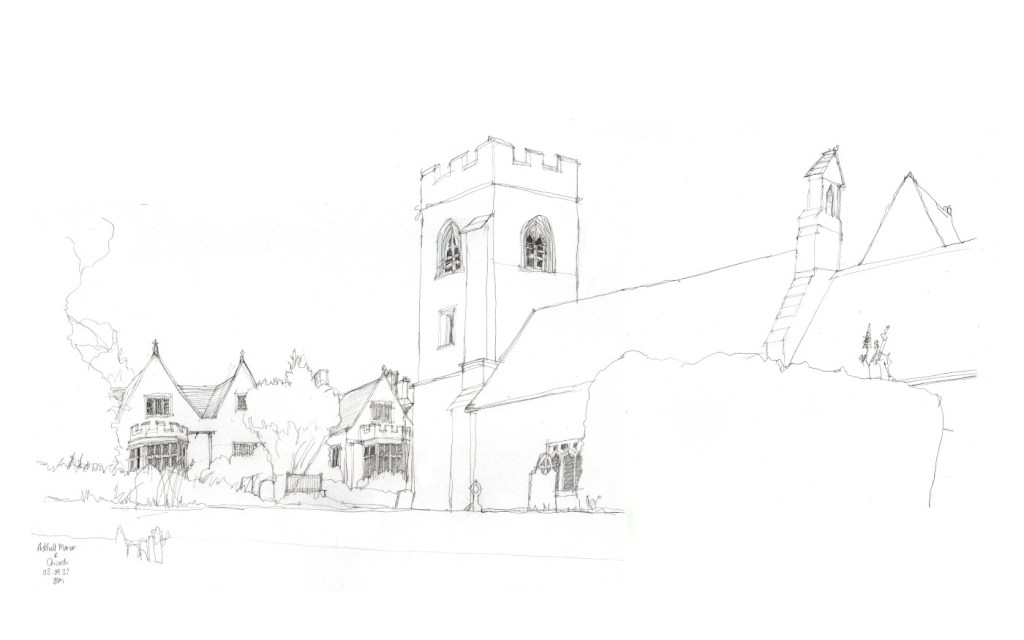 Asthall is a small village in West Oxfordshire. It is a few miles east of Burford along the Windrush valley and, although perhaps only a mile from the busy A40 road, is relatively quiet. I visited on a Saturday afternoon and apart from a few people walking to or from the pub it was almost deserted. Sitting next to the single track road that runs through the village I set about drawing St Nicholas’ Church.