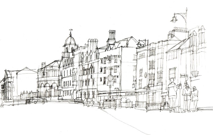 With the summer turning distinctly Autumnal, I’ve been trying to get out and do more drawing – before those evenings draw in and the temperatures drop. I’ve also been continuing with a fairly ambitious round of drawings – that is in terms of scope and complexity. With this in mind I went back to Oxford Broad Street to draw a slightly longer view.