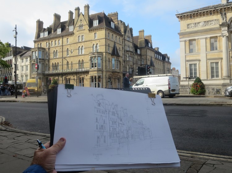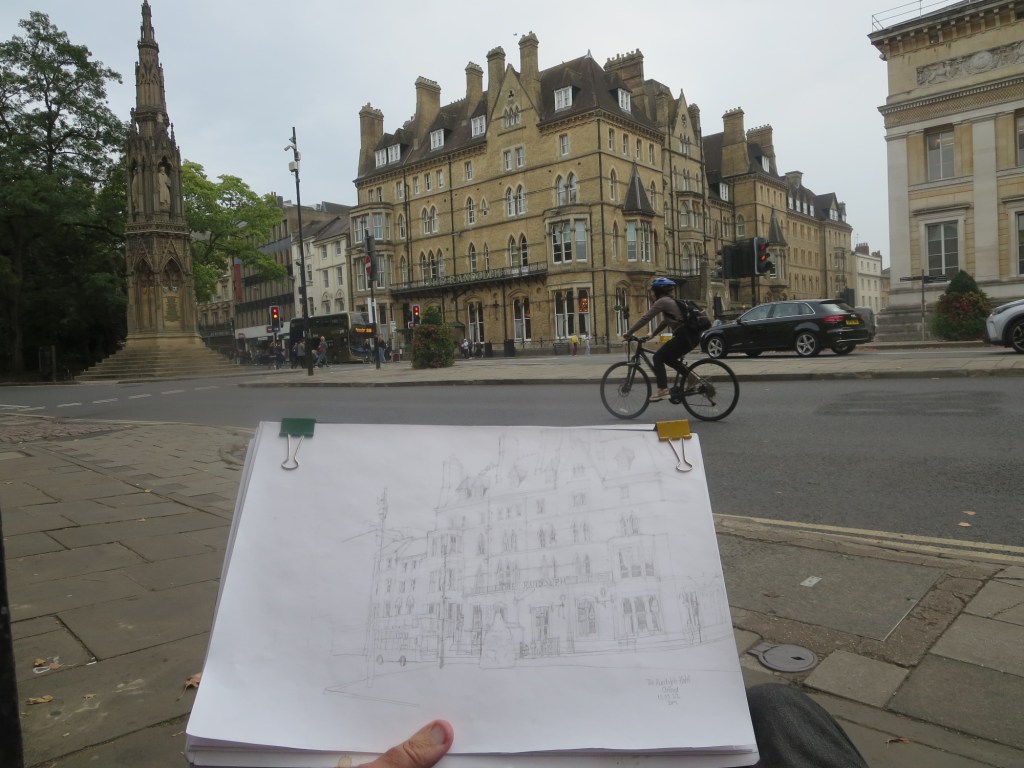 As you can imagine this took a while. With some of my larger and more complicated drawings I tend to break them up into sections. In this case I went back and drew some more – also adding a view of The Martyrs Monument and the front of the hotel (which faces the Ashmolean Museum). Here is that second drawing in-situ…