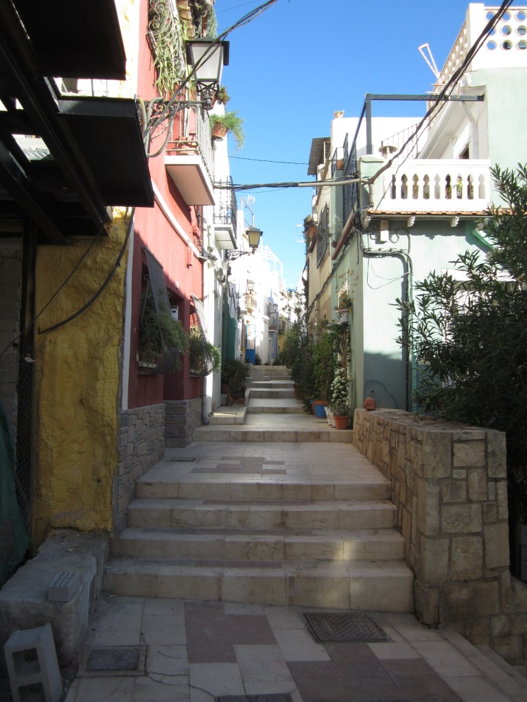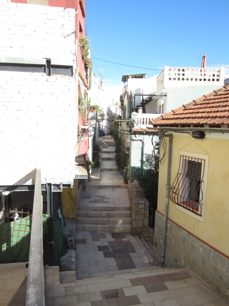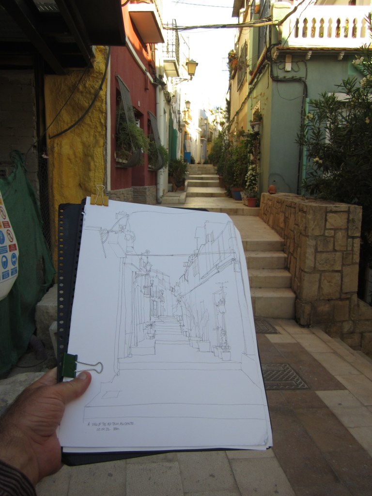 This pathway was lined with a jumble of colourful houses and an abundance of decorative potted plants – reflecting a certain pride in – and care of – the appearance along the way. It also makes for quite a challenging view for the urban sketcher to take in.