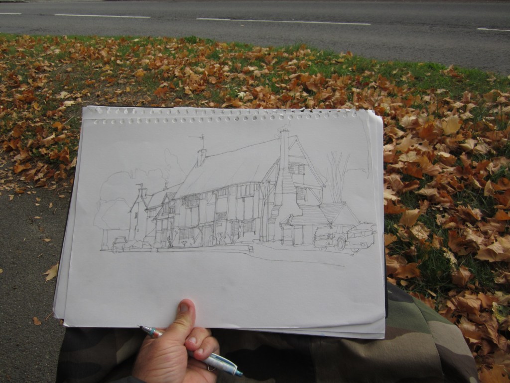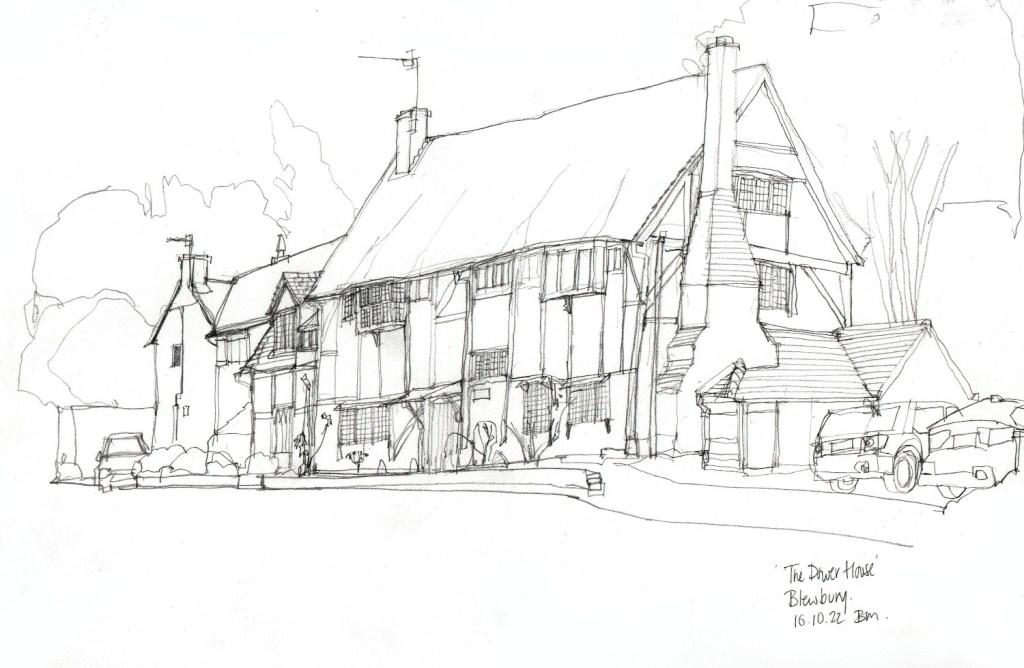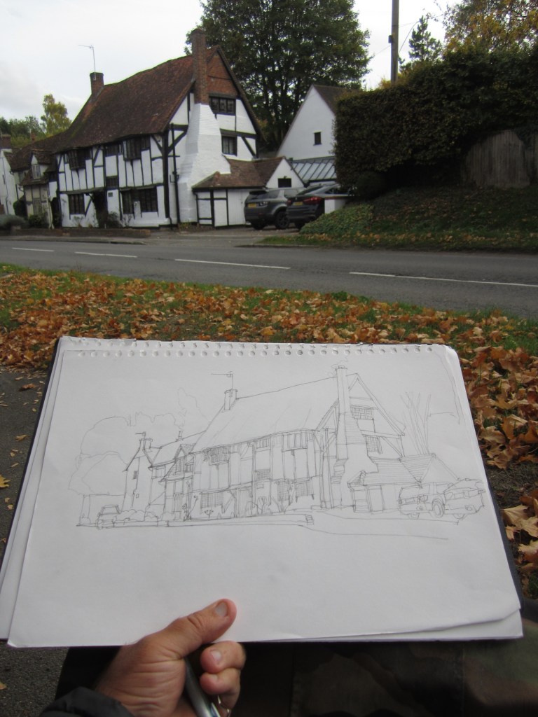 Visiting one Sunday, I set about drawing a large timber-framed house on the main road. This house is quirky enough to be interesting and it also has a great brick built chimney – as seen in my drawing, below.