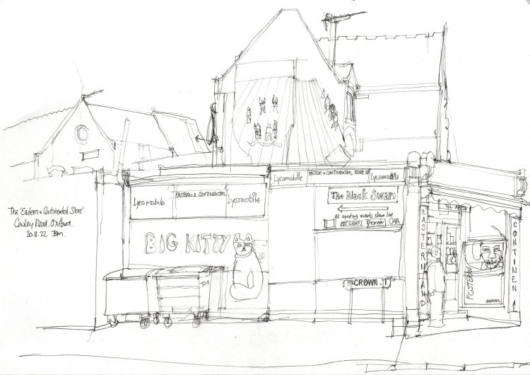 Last month seemed to be mostly showers and rain but with enough gaps in the weather to still go out and do some urban sketching. My last post was of the Zaid Store on the Cowley Road in east Oxford. This post is just me catching up with another of my shop studies, this time of the Eastern & Continental store which is a little further along the road.