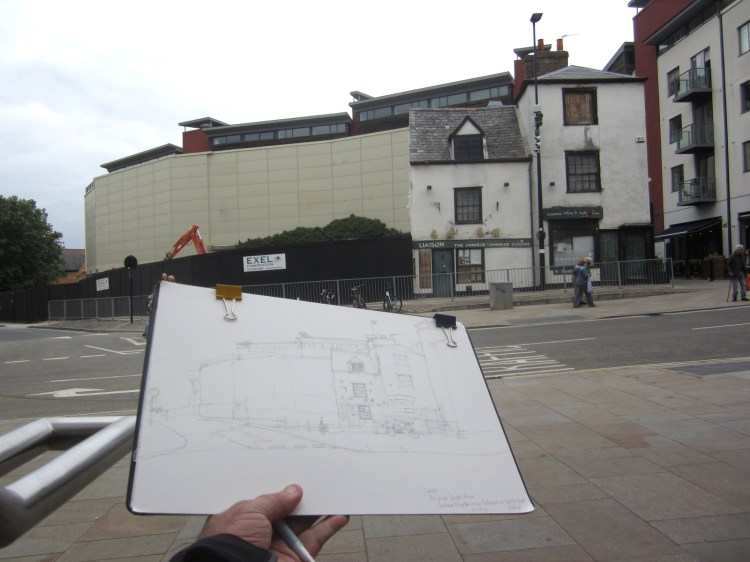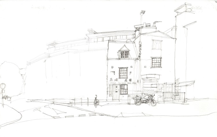 There is always building work going on in Oxford and one of these projects is the building of new flats on the corner of Paradise Street and Castle Street. I’ve done a couple of drawings of this as the construction has progressed and the mass of scaffolding and concrete appeals to the urban sketcher in me – especially when compared to the rather dusty and dilapidated Liaison Pekinese Takeaway next door. I guess this must be a listed building of some sort otherwise it would have been bulldozed in short order an incorporated into the rest.
