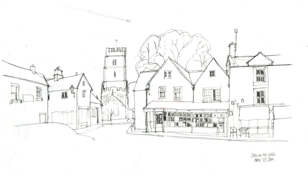After a short holiday in Ghent, Belgium I’ve been trying to get out more – starting to revisit various Cotswold’s towns and places. Northleach is a town I’ve visited on the way and done some sketching in. It is a old market town, that has a big ‘wool’ church and most of the town built in Cotswold stone. Visiting on a Easter Friday it was actually pretty quiet, with just the odd cafe and shop open. Here’s my view from the main car-part looking towards the church.