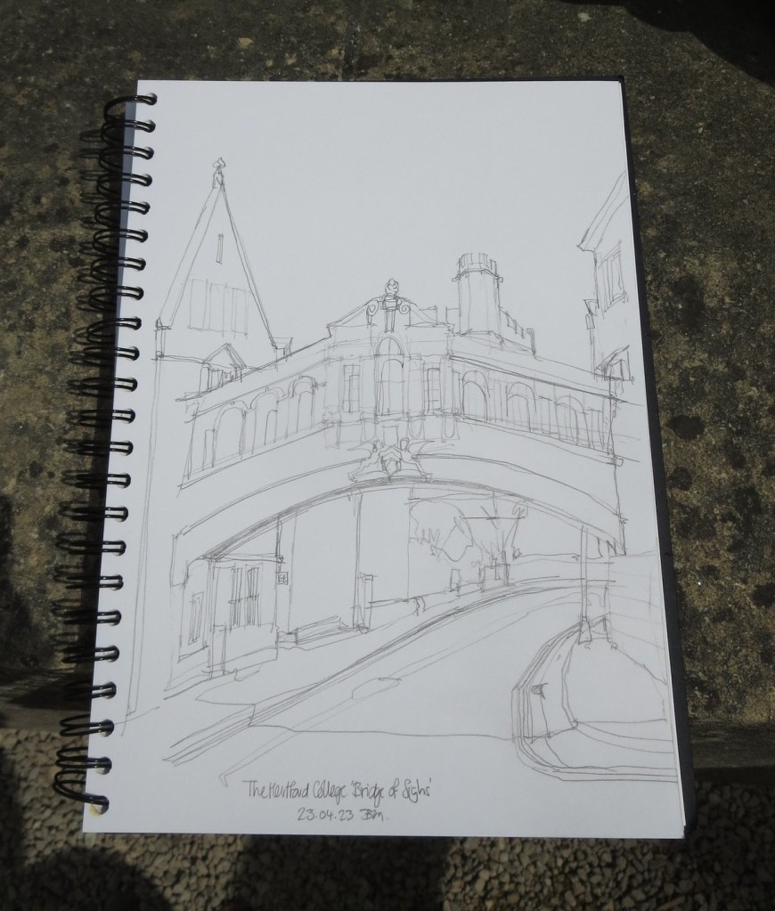 Moving along to the other end of the Bodleian I also tried another sketch of the Hertford College ‘Bridge of Sighs’- seen here from the railings next to the Bodleian.