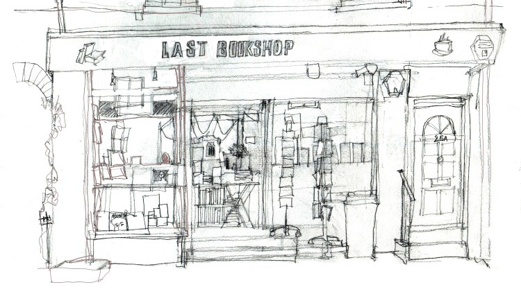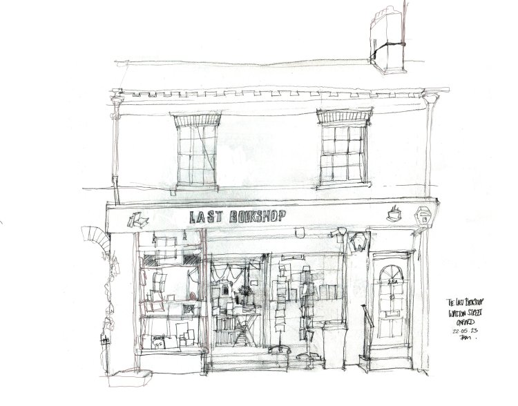 Over the past few days I’ve been doing some sketching around around the north of the city centre, mostly around what could loosely be called ‘the student quarter’ – otherwise known as little Clarendon Street. In amongst the bars and eateries there are some interesting shops – and one of these is ‘The Last Bookshop’ on near-by Walton Street.