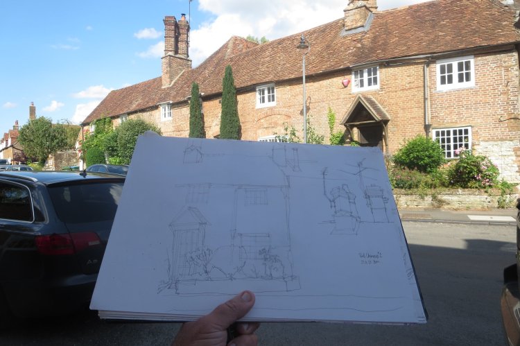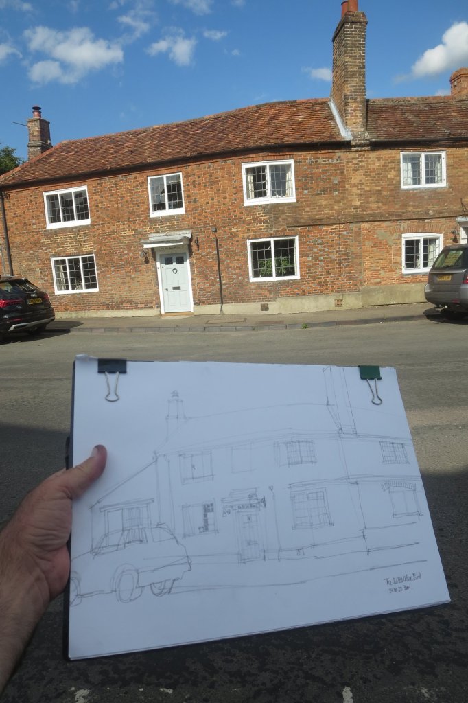 Yesterday I went back to Brill in western Buckinghamshire for another late lunch and to sit and do a little more sketching. My last post was about sketching the church here- and some of those Brill chimneys. On this trip, in the late afternoon sunshine I did some more house and chimney sketching to complete my earlier drawing- before moving on to sketch another of the old houses lining the High Street – this time the Old Post Office.