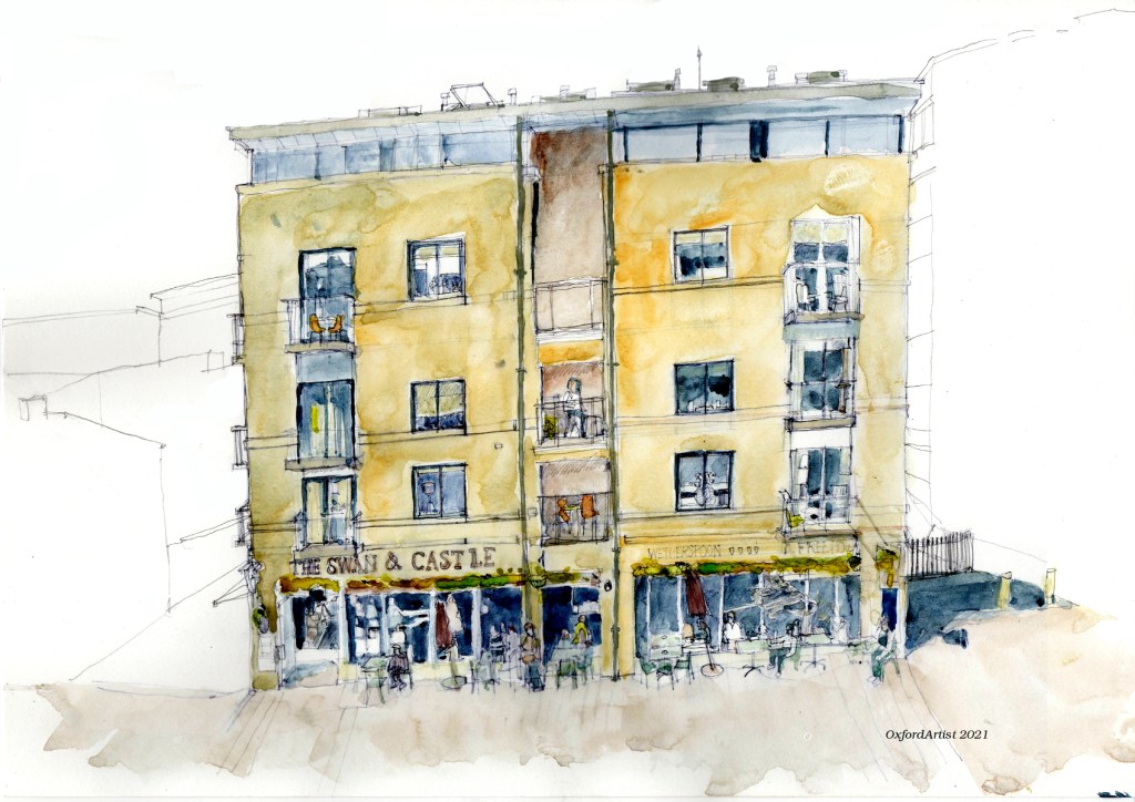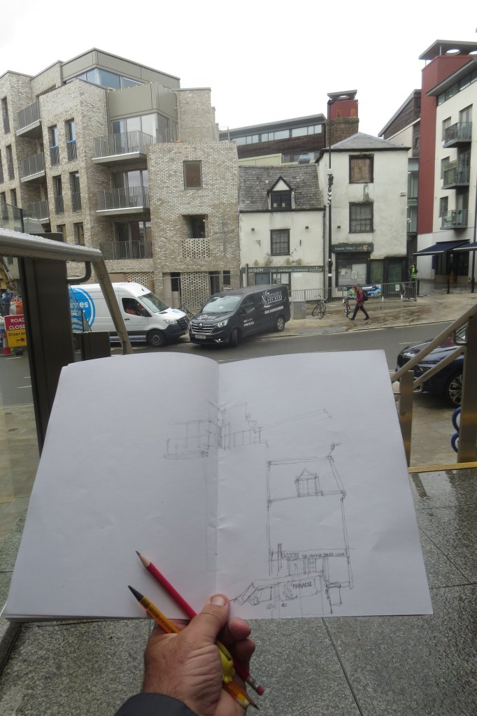 For those who are interested I’ve also done a whole series of previous drawings of this subject – and a few of the Weatherspoons pub next door as well. Here are a few quick snap-shots of those…